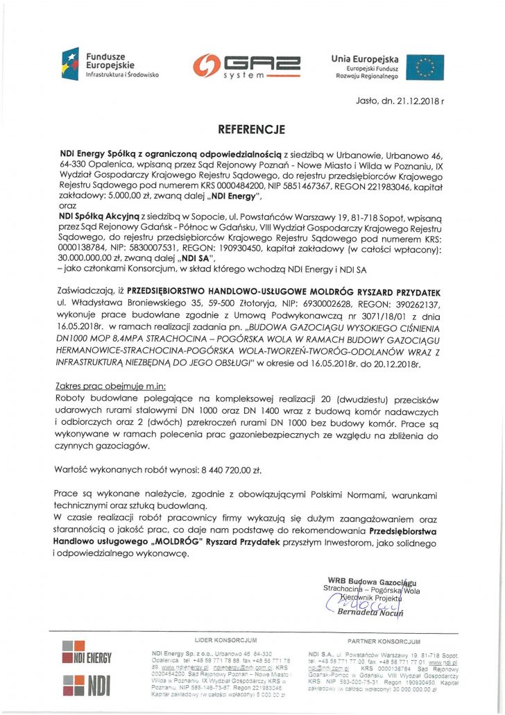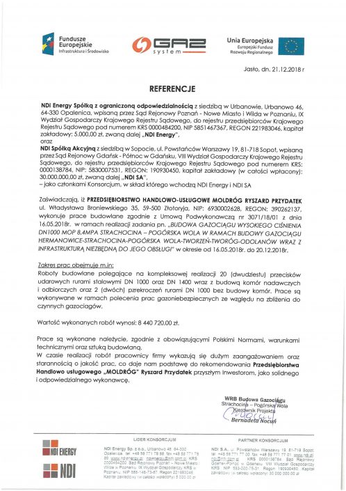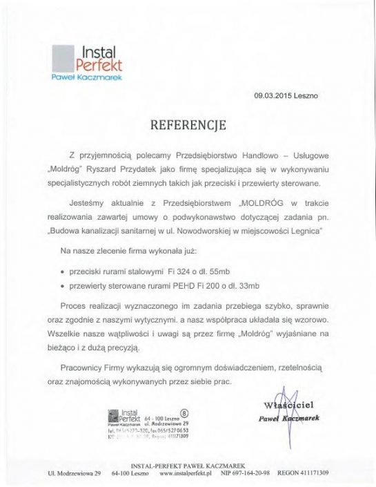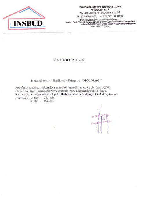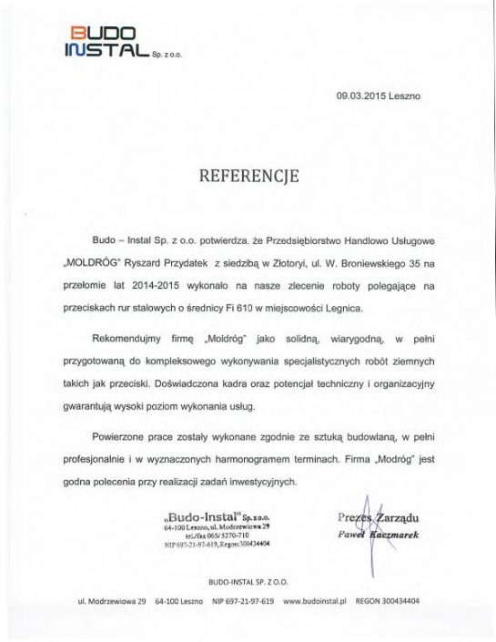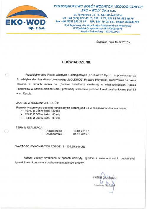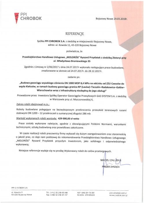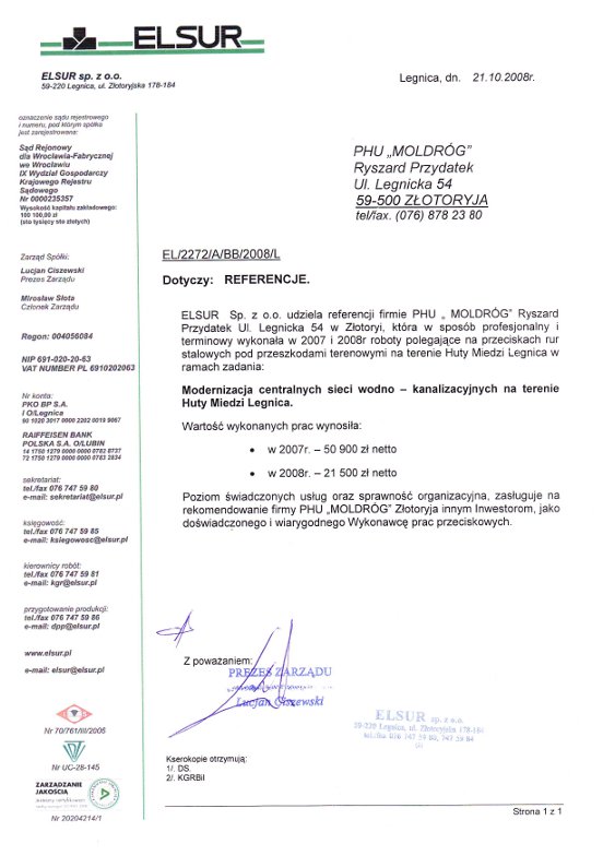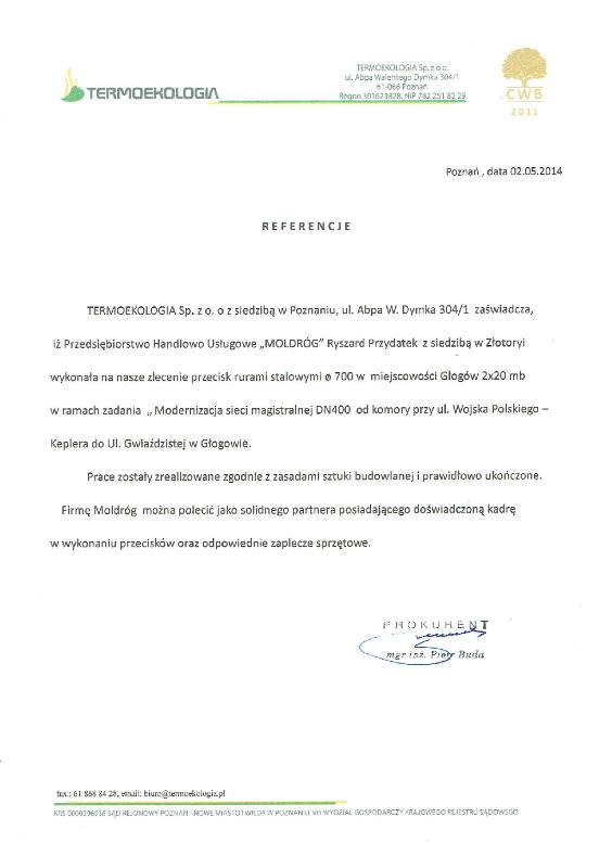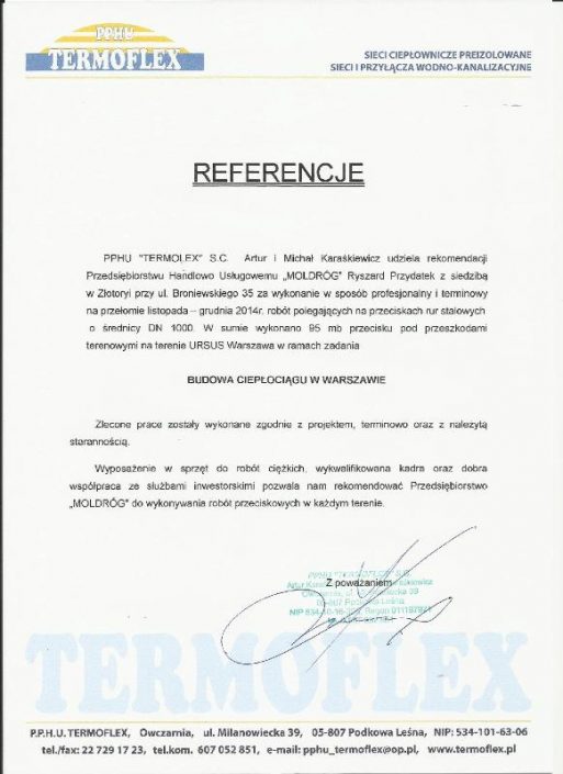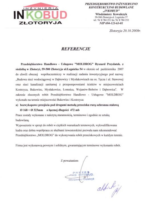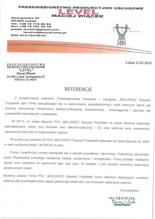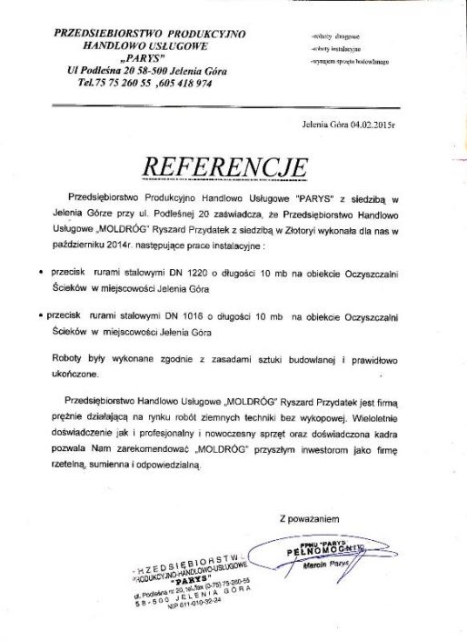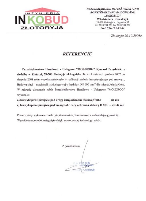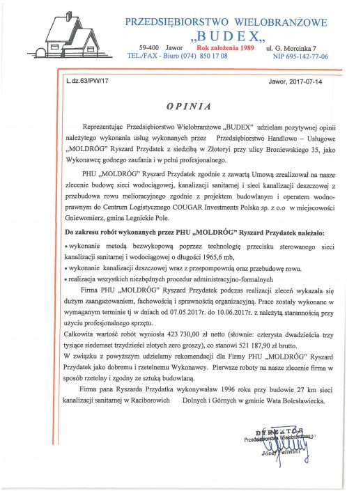 „Poziom świadczonych usług oraz sprawność organizacyjna zasługuje na rekomendowanie firmy PHU Moldróg Złotoryja innym inwestorom jako doświadczonego i wiarygodnego wykonawcę prac przeciskowych.”