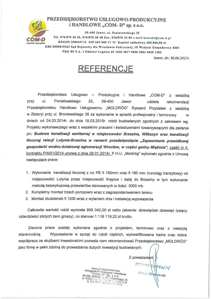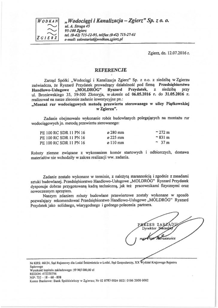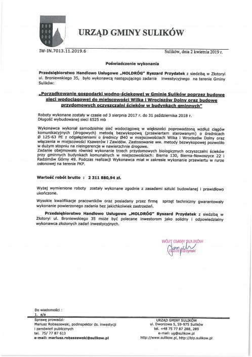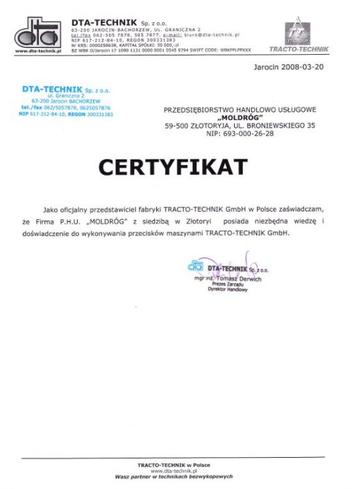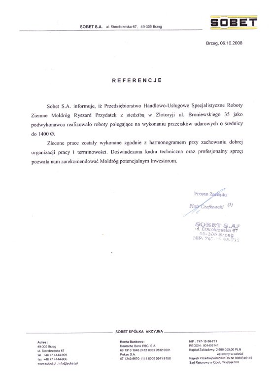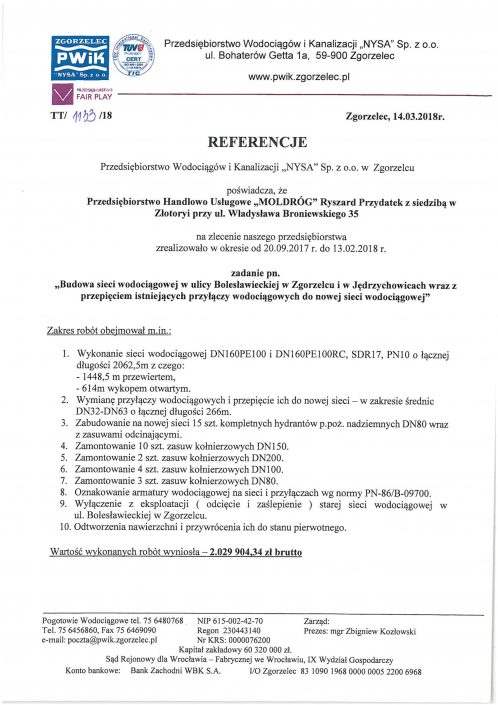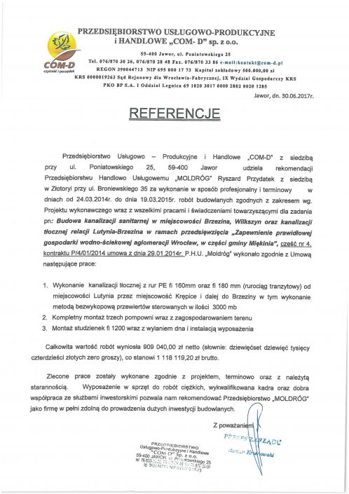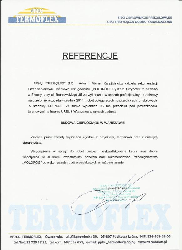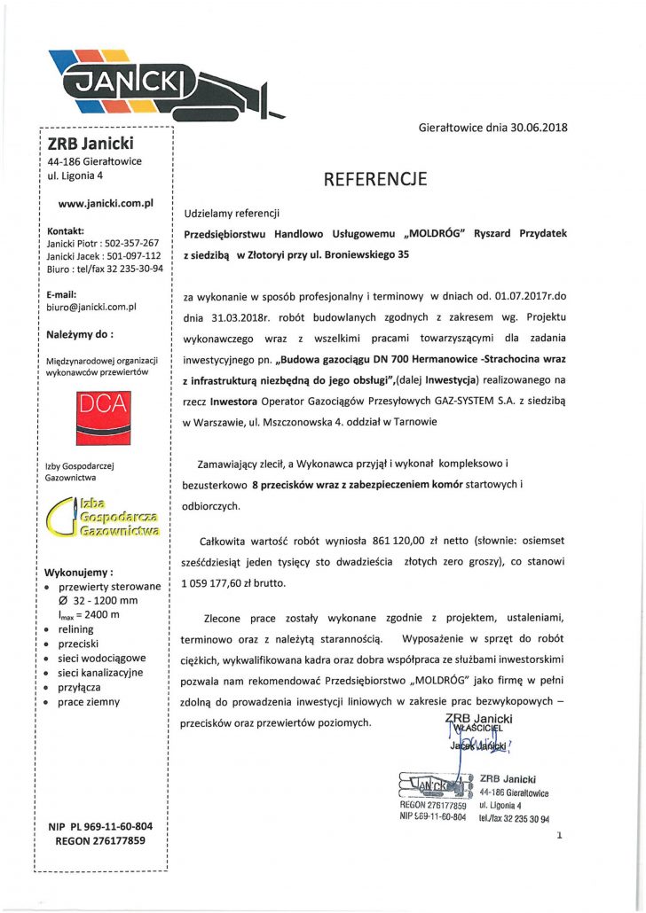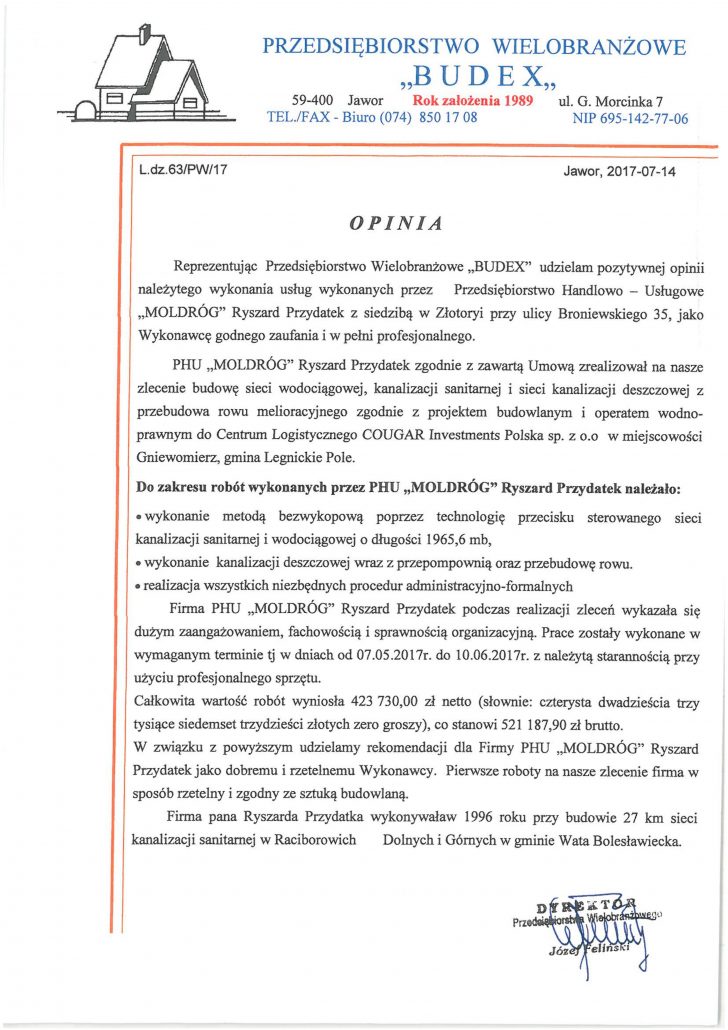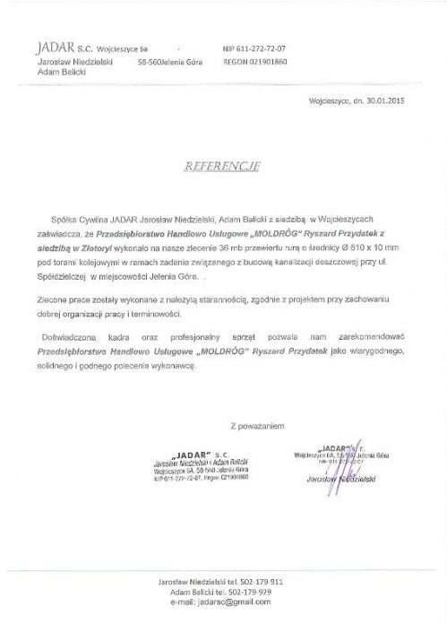„Poziom świadczonych usług oraz sprawność organizacyjna zasługuje na rekomendowanie firmy PHU Moldróg Złotoryja innym inwestorom jako doświadczonego i wiarygodnego wykonawcę prac przeciskowych.”