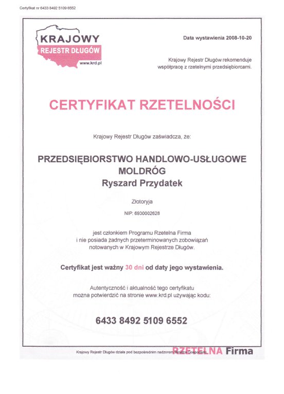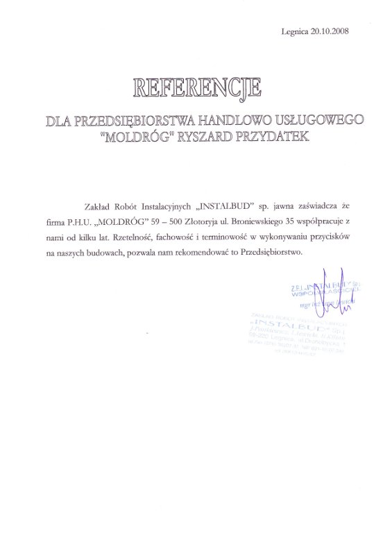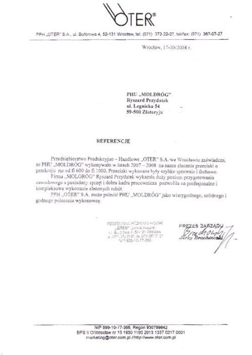 „Firma Moldróg Ryszard Przydatek wykazała duży poziom przygotowania zawodowego, a posiadany sprzęt i dobra kadra pracownicza pozwoliła na profesjonalne i kompleksowe wykonanie zleconych robót. PPH Other S.A. może polecić PHU Moldróg jako wiarygodnego, solidnego i godnego polecenia wykonawcę.”
