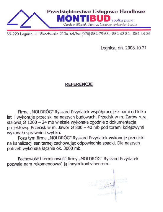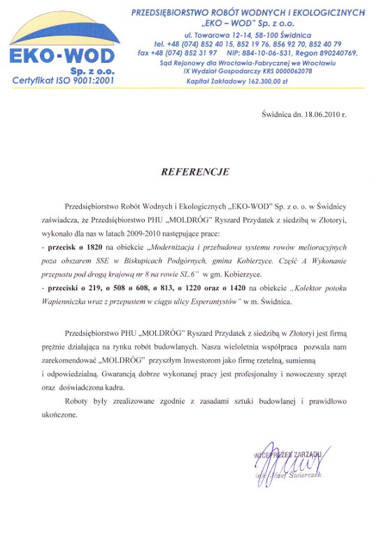 „Prace zostały wykonane z należytą starannością, terminowo i zgodnie ze sztuką budowlaną. Wyposażenie w sprzęt do robót w ciężkich warunkach terenowych, wykwalifikowana kadra oraz dobra współpraca ze służbami inwestorskimi pozwala nam rekomendować Przedsiębiorstwo Moldróg do wykonywania robót przeciskowych na każdym terenie. Firma jest wykonawcą pewnym i solidnym, gwarantującym terminowe wykonanie robót.”
