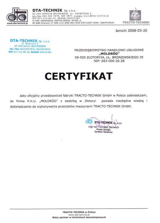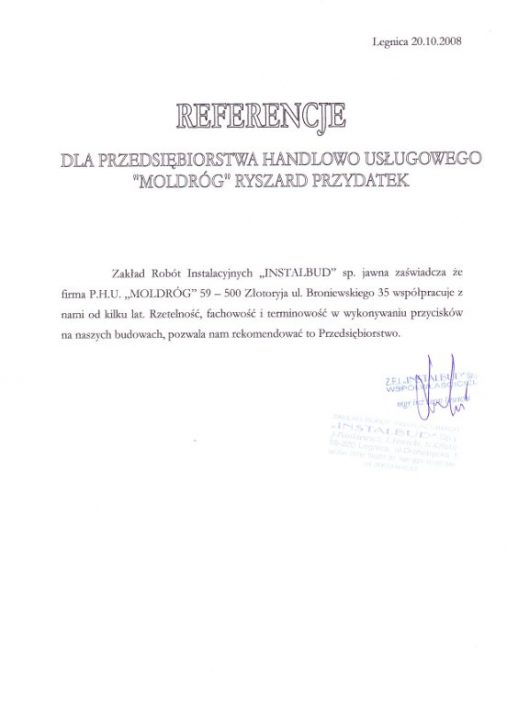 „Fachowość i terminowość firmy Moldróg Ryszard Przydatek pozwala nam rekomendować ją innym kontrahentom.”